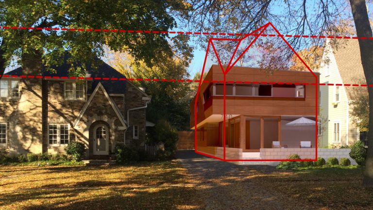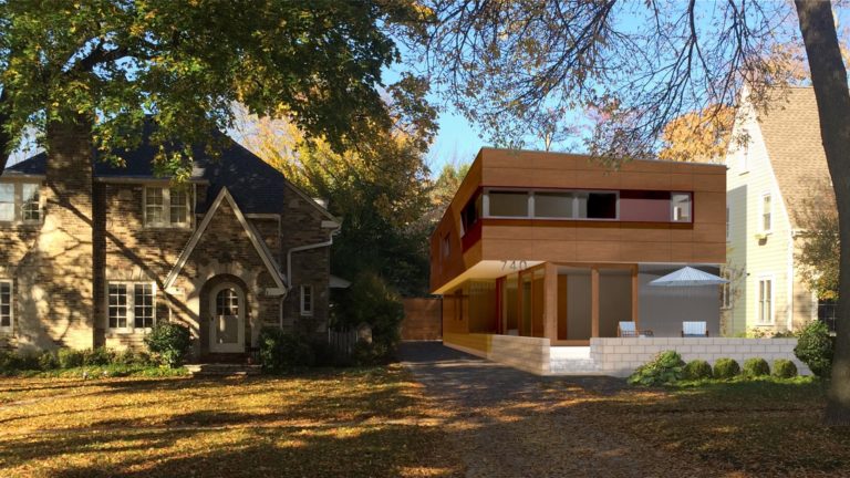 The Beaumont Modern is a single-family residential design located in the established Klode Park neighborhood of Whitefish Bay, where neighboring homes were primarily built during the early 20th century. The existing property was classified by the Village of Whitefish Bay as a non-conforming lot—its width was narrower that its zoning classification, and because the existing residence was located along the rear property line and within current zoning setback requirements. The narrow property width is the biggest constraint for any new residence. It is only 40′ wide, which leaves around 27′ for the house after considering building envelope setbacks and the driveway.
