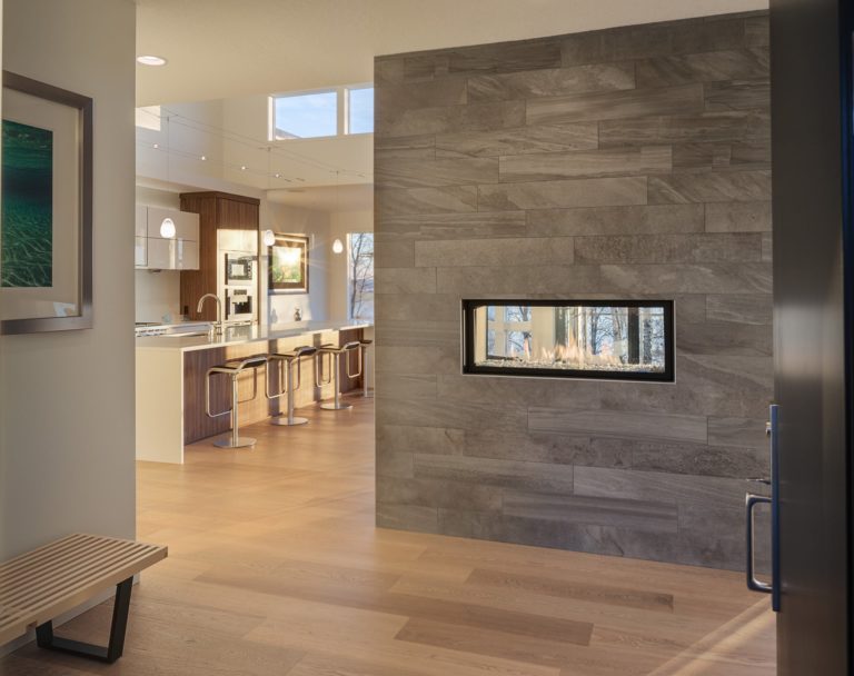 Another important client goal was having an open floor plan that opened onto an exterior deck. This interior/exterior relationship was established by creating an L-shape of interior spaces (dining, kitchen and living room) around the exterior deck. To enhance the indoor/outdoor connection, two ten-foot wide folding patio doors opened to a covered deck from the dining, kitchen and living room areas.