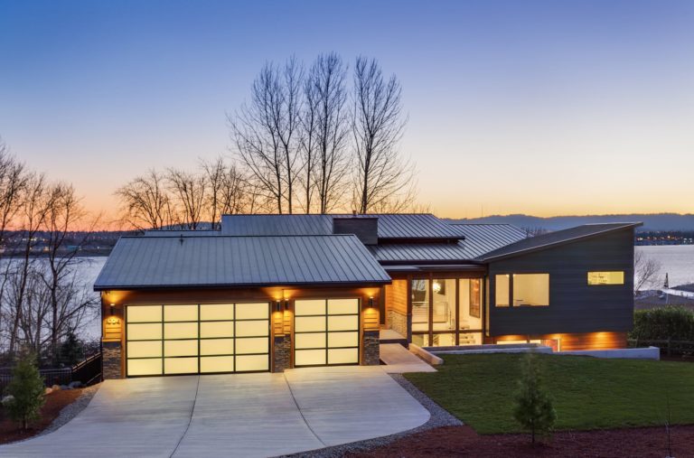 The most distinctive characteristic of the house design is the low sloping shed roof motif. The genesis of this concept was a request by the adjacent neighbor to not block their views of the river and city skyline. The neighbor’s house is elevated, which helped to preserve views but created another problem. The neighbor would be looking down slightly onto our design. With this in mind, we explored several roofline options that would generate a simple but visually interesting roofline. Of course, the roof geometry had to satisfy our client’s goals and constraints, too. The solution was to create a hierarchy of cascading shed roofs around the main living space that rises toward the various views.