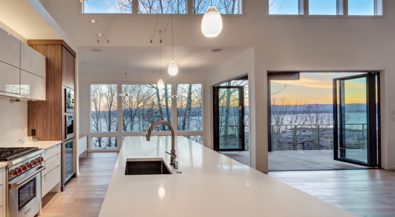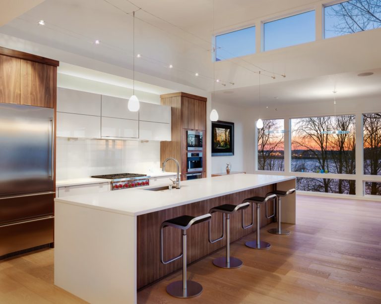 The owner’s primary goal was to maximize these views throughout the house. To achieve this goal, the house’s upper level (which has a ground-level entry) is elevated 12 feet on the river side. Every room along the river side are shaped (inverted L-shapes) to allow corner windows to capture views downriver. The kitchen island was located and designed to best capture these views, which are stunning at dusk.